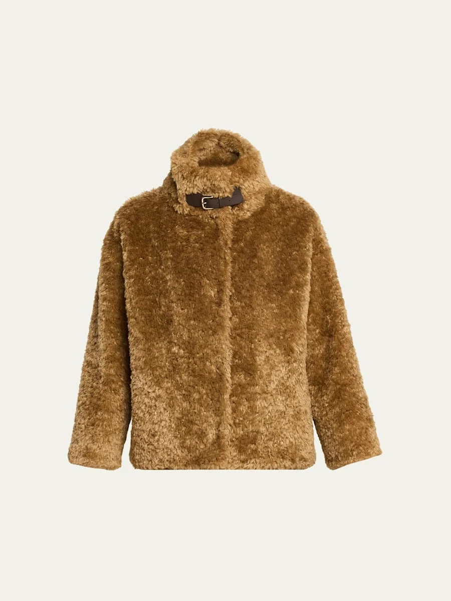 Crafted from a fuzzy faux fur, this teddystyle jacket by Herno features an adjustable faux leather strap for a utilitarian finish. Stand collar Long sleeves Classic fit Hem falls to the hip Concealed snapfront Polyester Lining: Rayon/viscose Dry clean; do not iron Imported