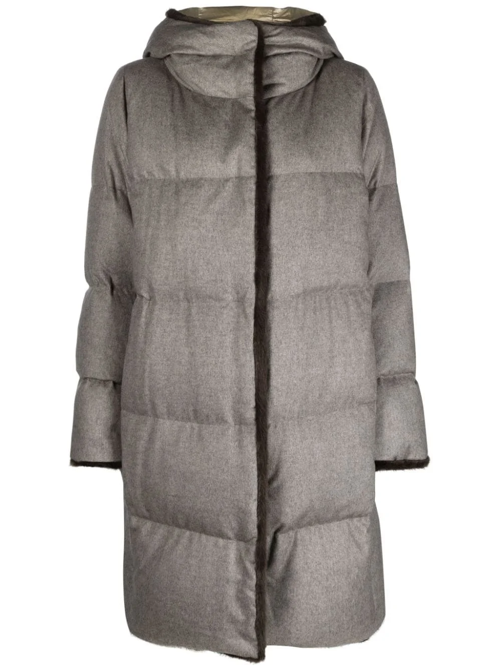 faux fur-lined quilted coat Herno continues to exhibit its sartorial eye for outerwear with this taupe-brown coat. It’s crafted in silk and cashmere-blend twill that’s quilted to evenly distribute the insulating and featherweight down fill, then lined with plush faux fur that peeks out at the edges. Highlights - Taupe brown - Cashmere-silk blend - Twill weave - Feather down - Faux-fur lining - Quilted - Panelled design - Classic hood - Long sleeves - Concealed front fastening - Thigh-length - Straight hem Made in Italy Composition Outer: Silk 51%, Cashmere 49% Lining: Polyester 100%, Down 90%, Feather 10% SIZE & FIT Model measurements Height 5 ft 10 in(1.78 m) Bust/Chest 31.49 in(80 cm) Hips 35.03 in(89 cm) Waist 23.62 in(60 cm) FittingInformation Designed to be unstructured, offering a loose fit throughout Made from a padded non-stretch fabric, giving it no natural elasticity This piece fits true to size – take your usual size Washing instructions Dry Clean Only