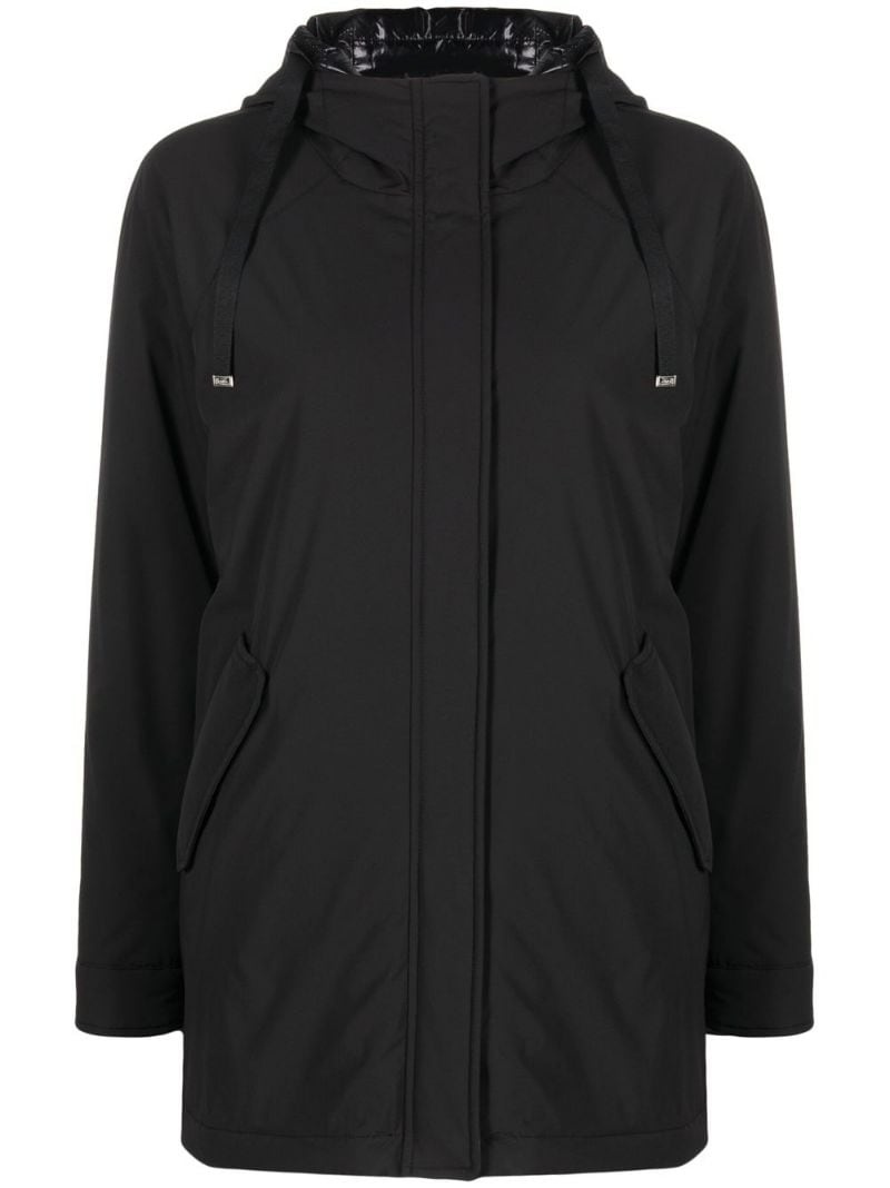 flap-pockets hooded padded jacket flap-pockets hooded padded jacket from HERNO featuring black, drawstring hood, concealed front fastening, long sleeves, two side flap pockets and straight hem. Imported Composition Outer: Polyurethane 100%, Polyamide 86%, Spandex/Elastane 14% Lining: Polyester 100%, Polyamide 100% SIZE & FIT Model measurements Height 5 ft 11 in(1.8 m) Bust/Chest 31.5 in(80 cm) Hips 35.4 in(90 cm) Waist 25.2 in(64 cm) FittingInformation This piece fits true to size. We recommend you get your regular size Cut for a loose fit Made with a mid-weight stretch fabric