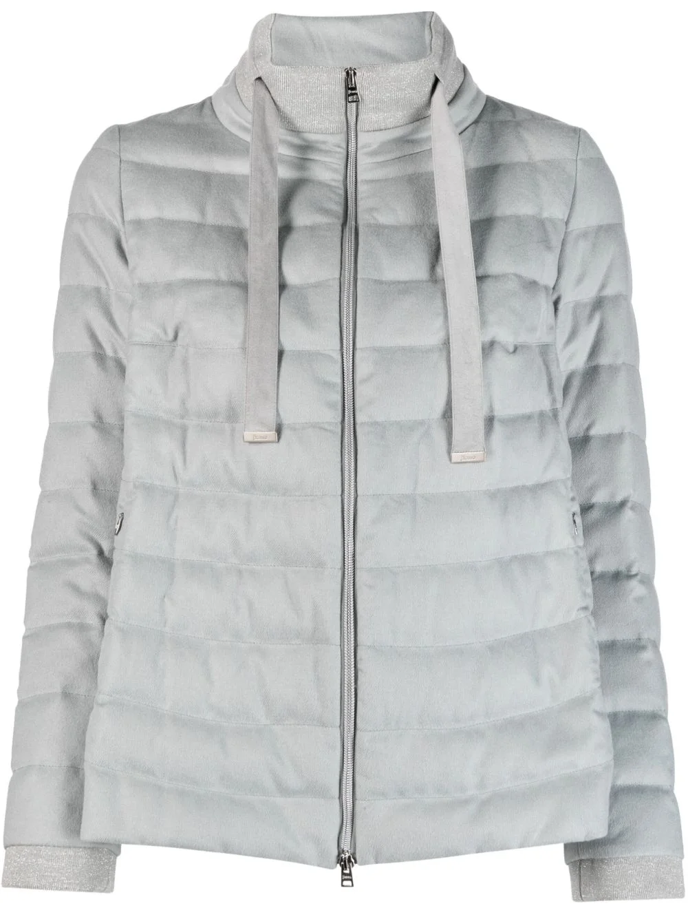 funnel-neck padded jacket Engineered for practicality and style, this padded jacket from Herno features a goose-down filling and a practical funnel neck silhouette with a drawstring fastening. Highlights - Light grey - Silk blend - Goose down - Padded design - Funnel neck - Drawstring neck - Front zip fastening - Long sleeves Made in Italy Composition Lining: Polyamide 100%, Goose Down 90%, Feather Down 10% Outer: Polyester 100%, Silk 51%, Cashmere 49% Washing instructions Dry Clean Only