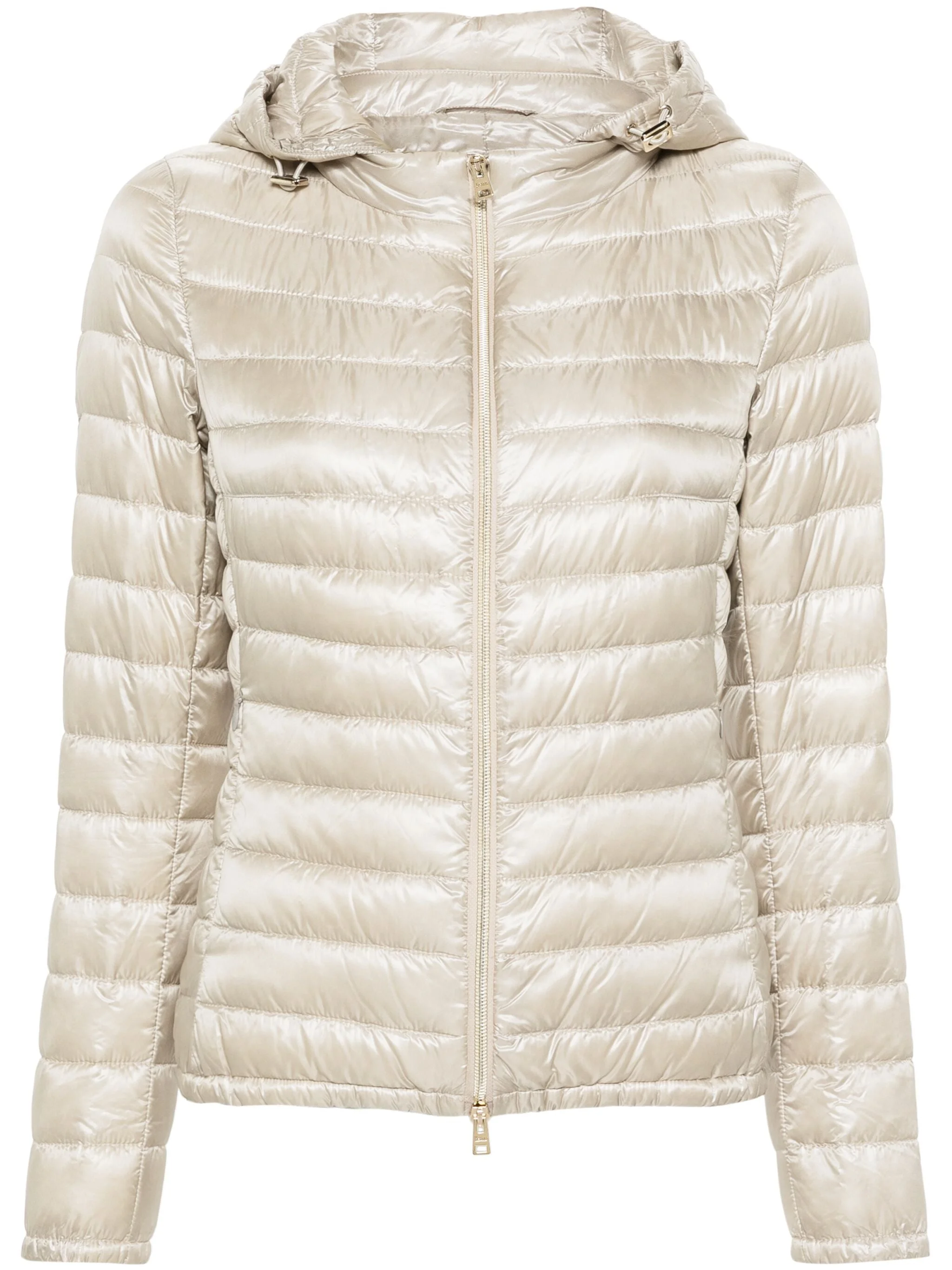 ecru feather down padded design quilted gold-tone logo plaque logo-engraved gold-tone hardware detachable drawstring hood front two-way zip fastening long sleeves elasticated cuffs two side zip-fastening pockets elasticated hem quilted lining - Color: NEUTRALS - Made in: Romania - Designer Style ID: 12017Z PI0005DIC 1985 Composition and care Lining Composition Feather Down: 100.0%, Outer Composition Polyamide: 100.0%, Lining Composition Polyamide: 100.0%