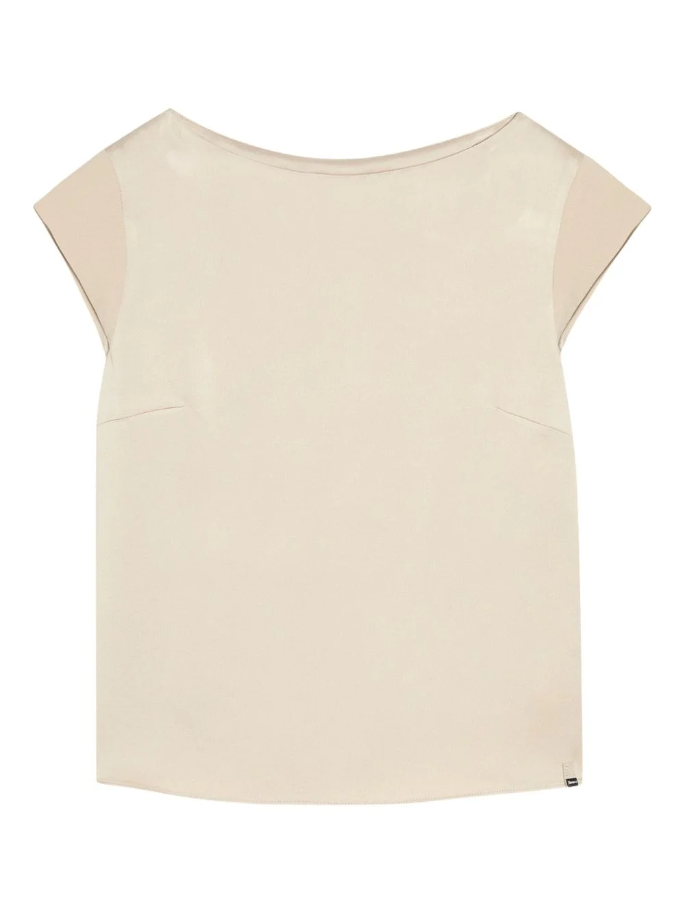 short-sleeves crepe top Highlights - Beige - Boat neck - Short sleeves - Straight hem Made in Italy Composition Acetate 72%, Viscose 28% Washing instructions Read Manufacturer Guidelines