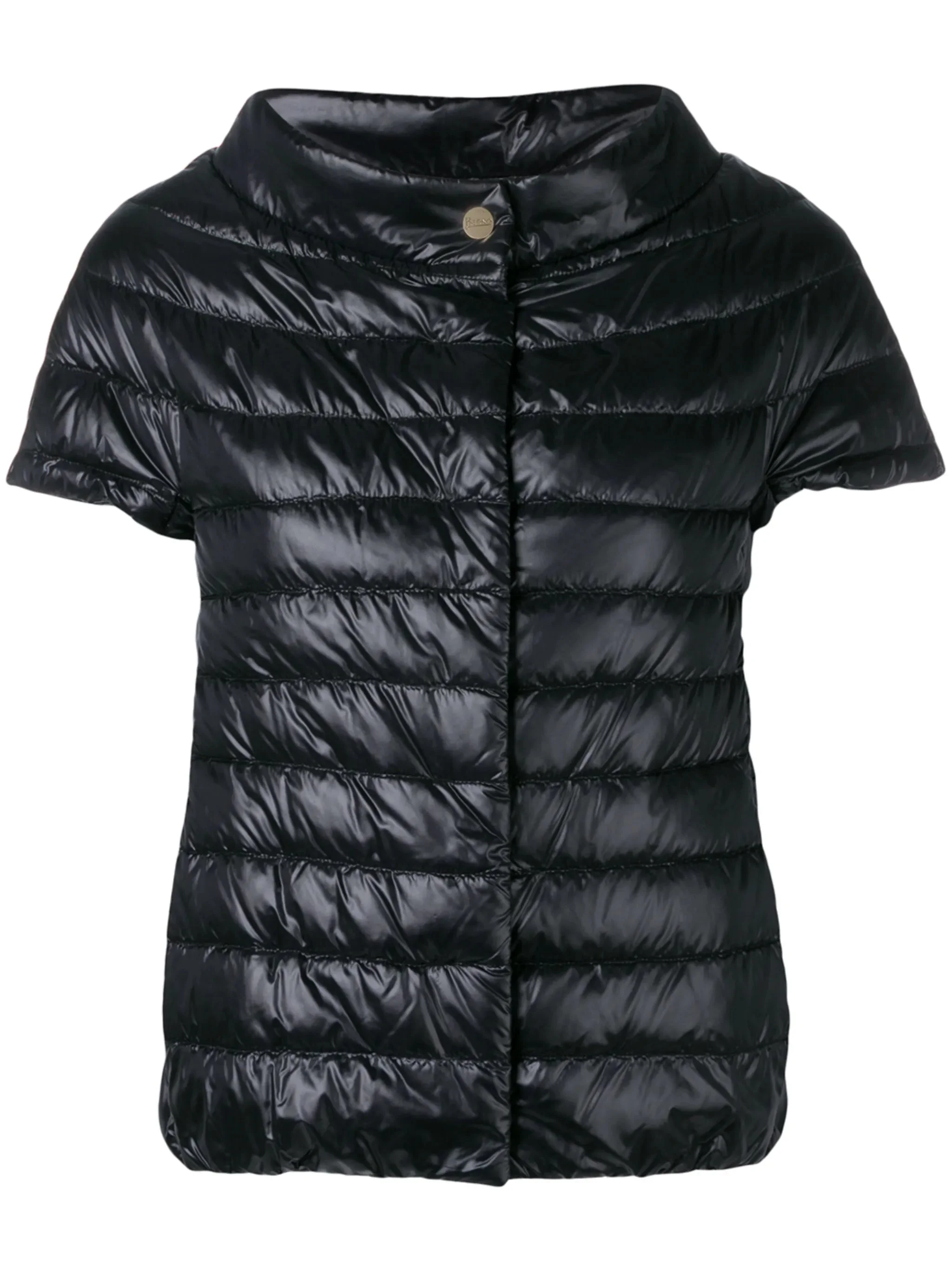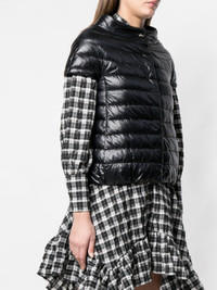 black goose down padded design quilted stand-up collar concealed front button fastening short sleeves elasticated hem - bust: 183.0 centimetres, length: 54.0 centimetres, waist: 93.0 centimetres - Color: BLACK - Made in: Romania - Designer Style ID: 12017Z PI0003DIC 9300 Composition and care Outer Composition Cotton: 60%, Outer Composition Polyamide: 100%, Lining Composition Polyamide: 100%, Outer Composition Acetate: 40%, Lining Composition Feather: 10%, Lining Composition Goose Down: 90%