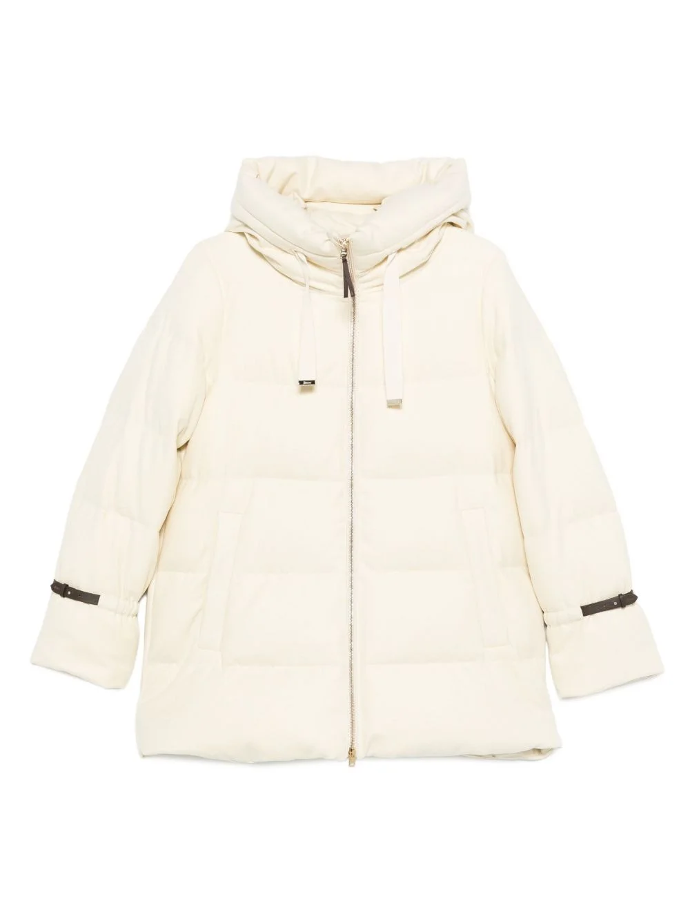 hooded quilted jacket Highlights Made in Italy Composition Outer: Polyurethane 100%, Wool 92%, Cotton 55%, Polyester 45%, Metal 5%, Elastane 3% Lining: Polyamide 100%, Goose Down 90%, Goose Feather 10% SIZE & FIT Model measurements Height 5 ft 10 in(1.79 m) Bust/Chest 31.88 in(81 cm) Hips 35.43 in(90 cm) Waist 23.62 in(60 cm)