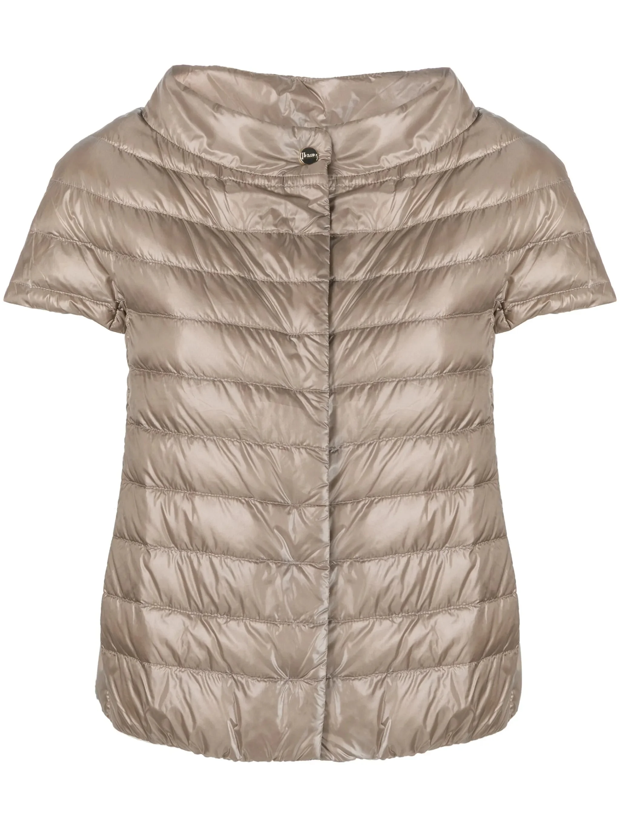 taupe brown down-feather filling quilted padded design round neck concealed press-stud fastening short sleeves two side welt pockets straight hem - Color: BROWN - Made in: Romania - Designer Style ID: 12017Z PI0003DIC 2600 Composition and care Outer Composition Cotton: 55.0%, Outer Composition Polyamide: 100.0%, Lining Composition Polyamide: 100.0%, Outer Composition Polyester: 45.0%, Lining Composition Goose Down: 100.0%