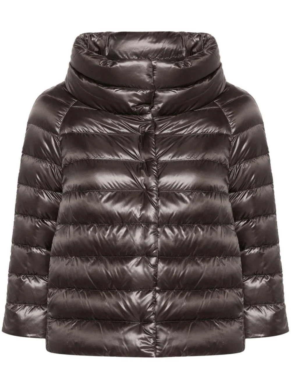 funnel-neck down jacket Highlights - Grey - Glossy finish - Goose down - Padded design - Funnel neck - Concealed front press-stud fastening - Three-quarter length sleeves - Two side slit pockets - Straight hem - Full lining Imported Composition Outer: Polyamide 100%, Cotton 55%, Polyester 45% Lining: Polyamide 100%, Goose Down 100% SIZE & FIT Model measurements Height 5 ft 10 in(1.78 m) Bust/Chest 31.49 in(80 cm) Hips 37 in(94 cm) Waist 23.62 in(60 cm) FittingInformation Designed for a relaxed fit, this piece allows for comfort and movement when worn Made from a padded non-stretch fabric, giving it no natural elasticity This piece fits true to size – take your usual size