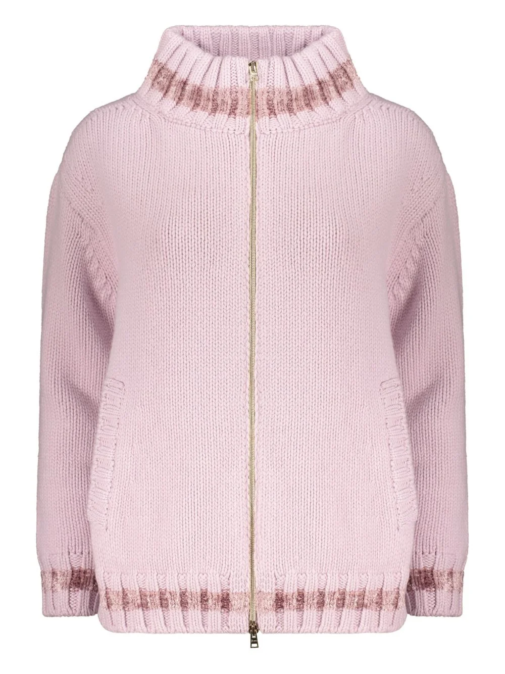 high-neck ribbed cardigan Highlights - Light purple - High neck - Zip closure - Front pockets - Ribbed hem Made in Italy Composition Viscose 72%, Polyamide 28% Lining: Polyamide 100%, Viscose 50%, Cotton 50% Outer: Wool 100% SIZE & FIT FittingInformation Designed for a relaxed fit, this piece allows for comfort and movement when worn Made with a midweight knit, this piece offers some stretch Washing instructions Read Manufacturer Guidelines