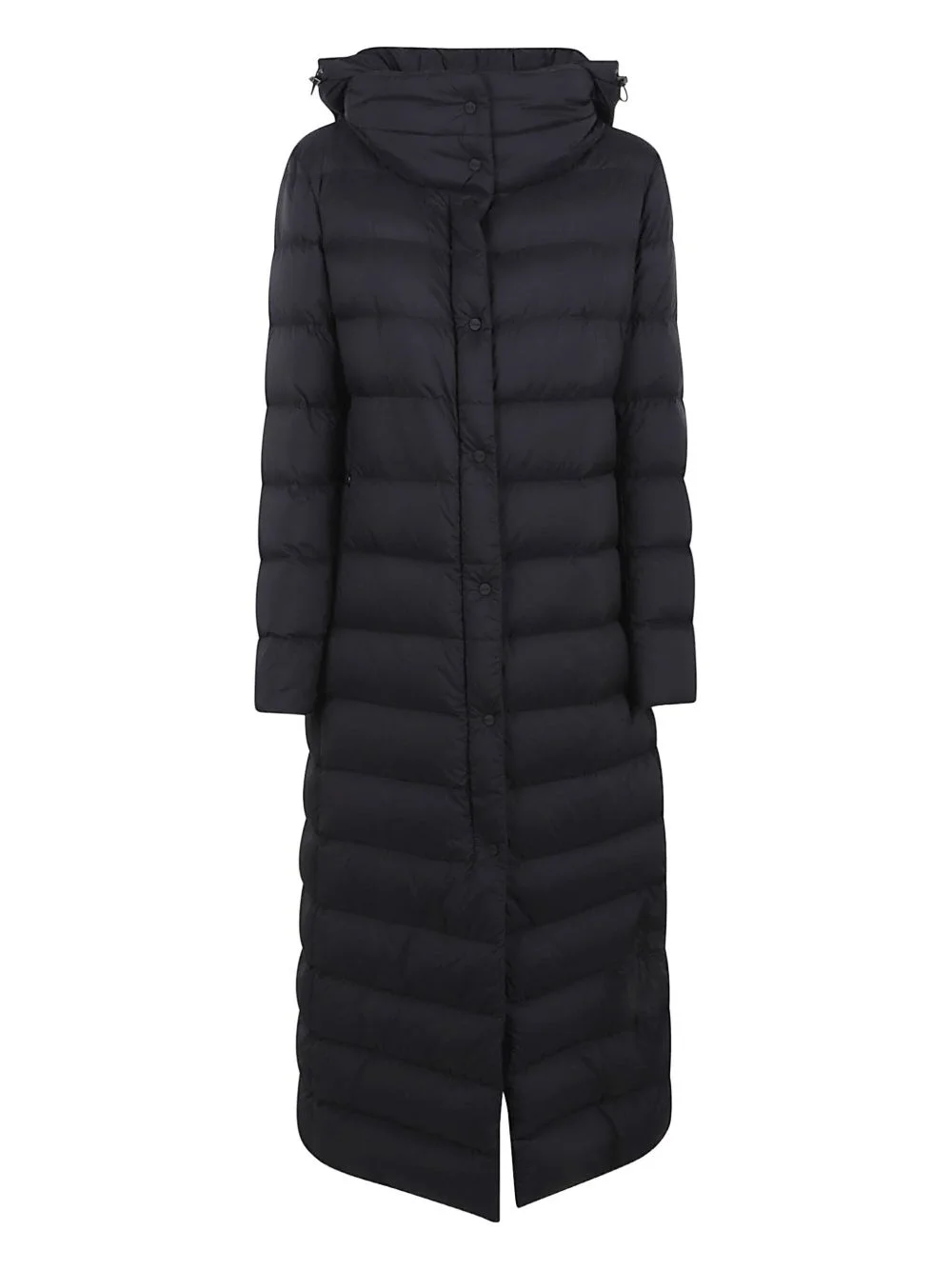 hooded buttoned jacket Highlights - Black - Hooded - Button fastening - Long sleeves - Quilted effect - Long length Imported Composition Outer: Polyamide 100%, Polyurethane 100% Lining: Polyamide 100%, Down 90%, Feather 10% Washing instructions Read Manufacturer Guidelines
