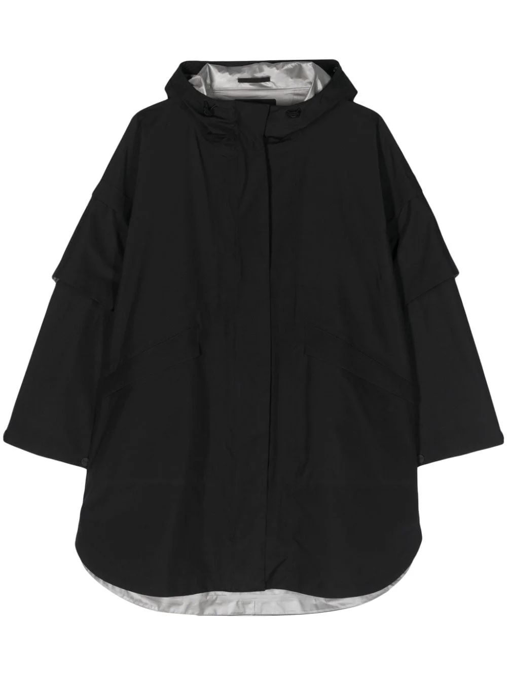 hooded cape coat Highlights - Black - Cape design - Drawstring hood - Front press-stud and zip fastening - Detachable sleeves - Press-stud fastening side slits - Two side zip-fastening pockets - Curved hem - Thigh-length Imported Composition Polyester 100%