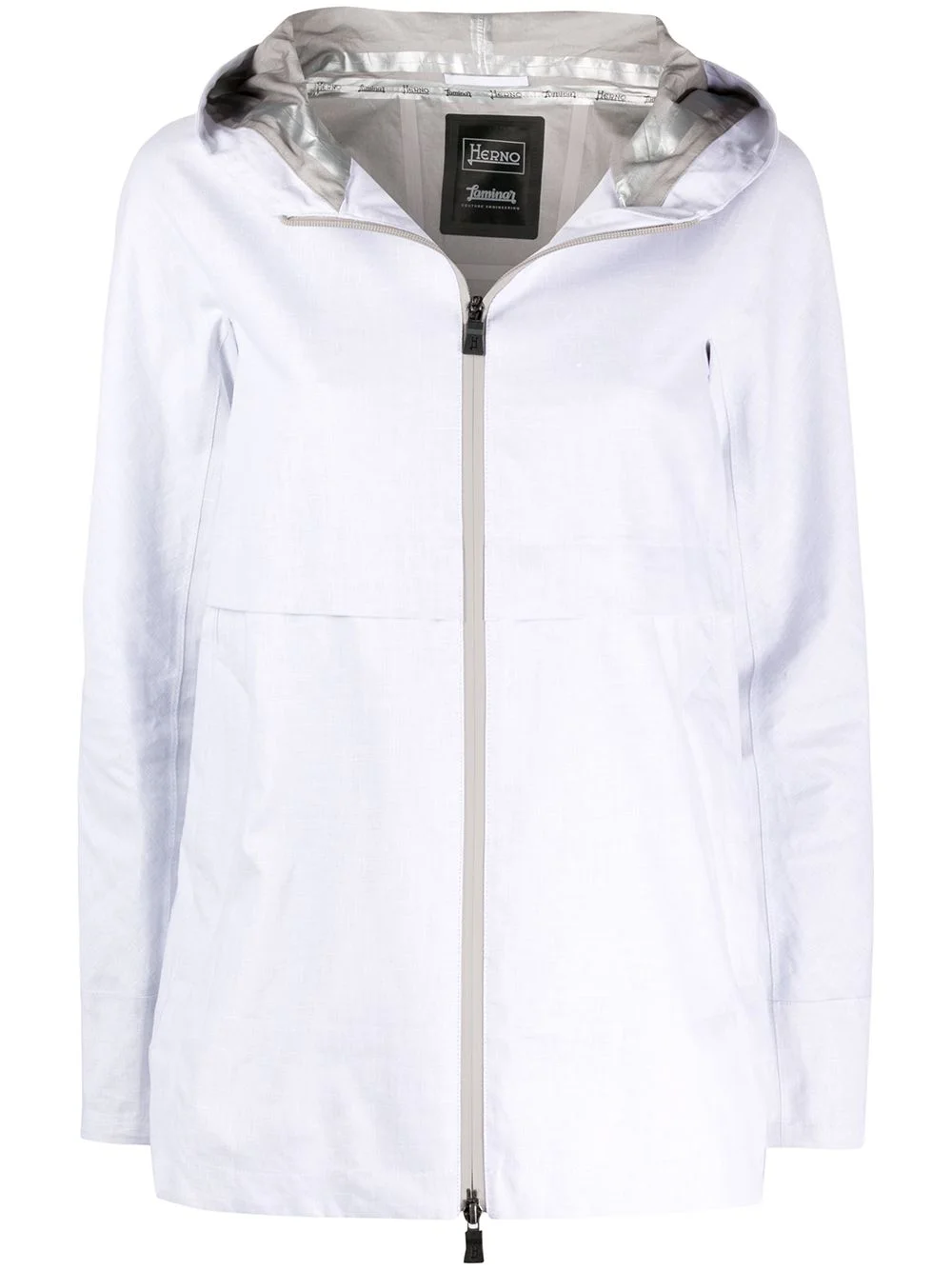 hooded double-slider zip coat White linen hooded double-slider zip coat from Herno featuring a front zip fastening, long sleeves, side pockets, a curved hem and a mid-length. POSITIVELY CONSCIOUS: At least 50% of the main material of this product meets our conscious criteria: for example, it's either organic, recycled, upcycled, or independently recognised as being better for the environment (such as linen, ramie, Tencel, etc.). Imported Composition Outer: Linen/Flax 100% Lining: Polyester 100% SIZE & FIT Model measurements Height 5 ft 10 in(1.78 m) Bust/Chest 33.07 in(84 cm) Hips 35.82 in(91 cm) Waist 25.98 in(66 cm) FittingInformation This piece fits true to size. We recommend you get your regular size Cut for a loose fit Made with a mid-weight non-stretch fabric Washing instructions Dry Clean Only