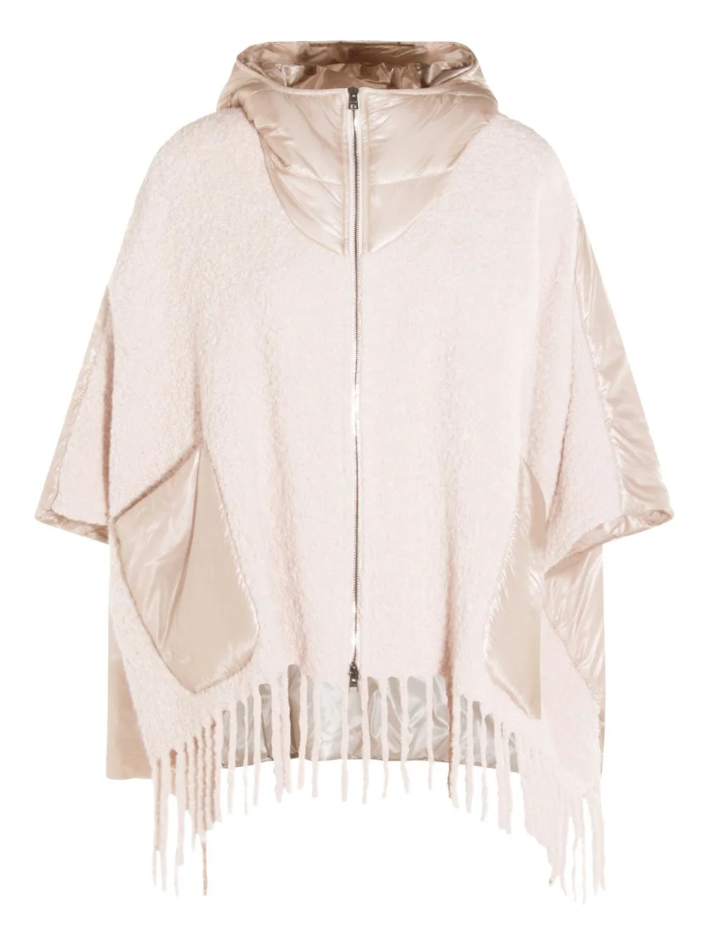 hooded fringed cape Highlights - Champagne beige - Quilted panelling - Fleece texture - Zip front fastening - Fringed hem - Fixed hood - Cape design Made in Italy Composition Alpaca 90%, Polyamide 10% Washing instructions Read Manufacturer Guidelines