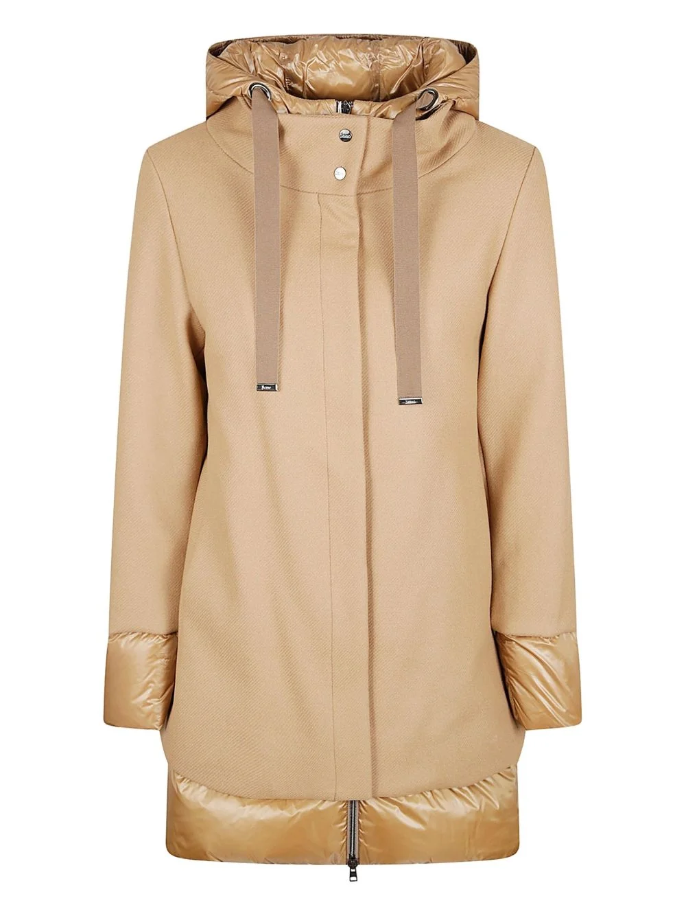 hooded jacket Highlights - Caramel brown - Hood - Press stud fastening - Zip fastening - Cuff detailing - Long sleeves Made in Italy Composition Lining: Nylon 100% Outer: Virgin Wool 75%, Nylon 25% Down 90%, Feather 10% Washing instructions Read Manufacturer Guidelines