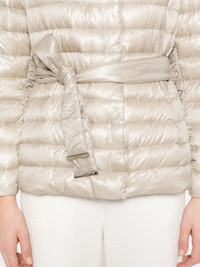 hooded puffer jacket Highlights - Light beige - Concealed front button fastening - Quilted - Two side zip-fastening pockets - Self-tie fastening Imported Composition Outer: Polyamide 100%, Cotton 55%, Polyester 45% Lining: Polyamide 100%, Goose Down 90%, Goose Feather 10% SIZE & FIT Model measurements Height 5 ft 10 in(1.78 m) Bust/Chest 33.85 in(86 cm) Hips 36.61 in(93 cm) Waist 26.77 in(68 cm) FittingInformation Designed for a relaxed fit, this piece allows for comfort and movement when worn The tie fastening gives an adaptable and personalised fit Made from a padded non-stretch fabric, giving it no natural elasticity Washing instructions Hand Wash