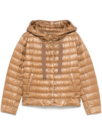 hooded puffer jacket Highlights - Caramel brown - Concealed front press-stud fastening - Drawstring hood - Two side welt pockets - Long sleeves Imported Composition Lining: Polyamide 100%, Goose Down 90%, Goose Feather 10% Outer: Cotton 55%, Polyester 45% Washing instructions Hand Wash