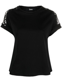 lace-detailing cotton T-shirt Highlights - Black - Cotton - Lace detailing - Sequin embellishment - Round neck - Short sleeves - Straight hem Imported Composition Cotton 100%, Polyester 100% Washing instructions Dry Clean Only