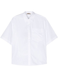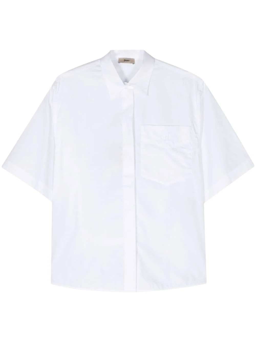 logo-embroidered cotton shirt Highlights - Optical white - Cotton - Poplin texture - Embroidered logo at the chest - Classic collar - Concealed front button fastening - Short sleeves - Chest patch pocket - Side slits - High-low curved hem Imported Composition Cotton 100%