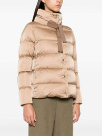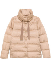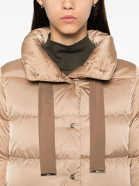 beige feather down padded design front press-stud fastening drawstring neck high neck long sleeves two side slit pockets full lining straight hem Size & Fit Model Measurements: Height: 1.78 m Bust/Chest: 84.0 cm Hips: 92.0 cm Waist: 62.0 cm Model wears size 40 Fabric and Care Designer Style ID: PI001936D12170Z Designer Colour: 2157 CAMMELLO Composition: Outer: Polyester 100%; Lining: Feather 20%, Down 80%, Polyamide 100% Washing instructions: Dry Clean Only Made in Romania