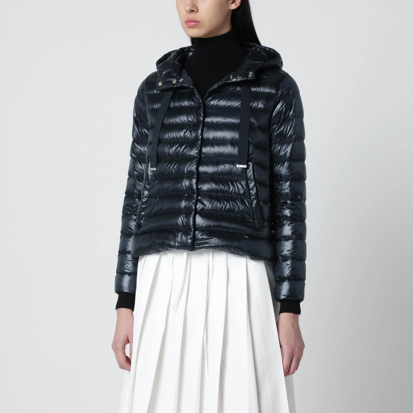 Herno navy blue ultralight nylon puffer jacket with regular fit striped quilting down filling hood with gros-grain drawstring two side pockets hidden snap-button closure and side slits with metal detail.