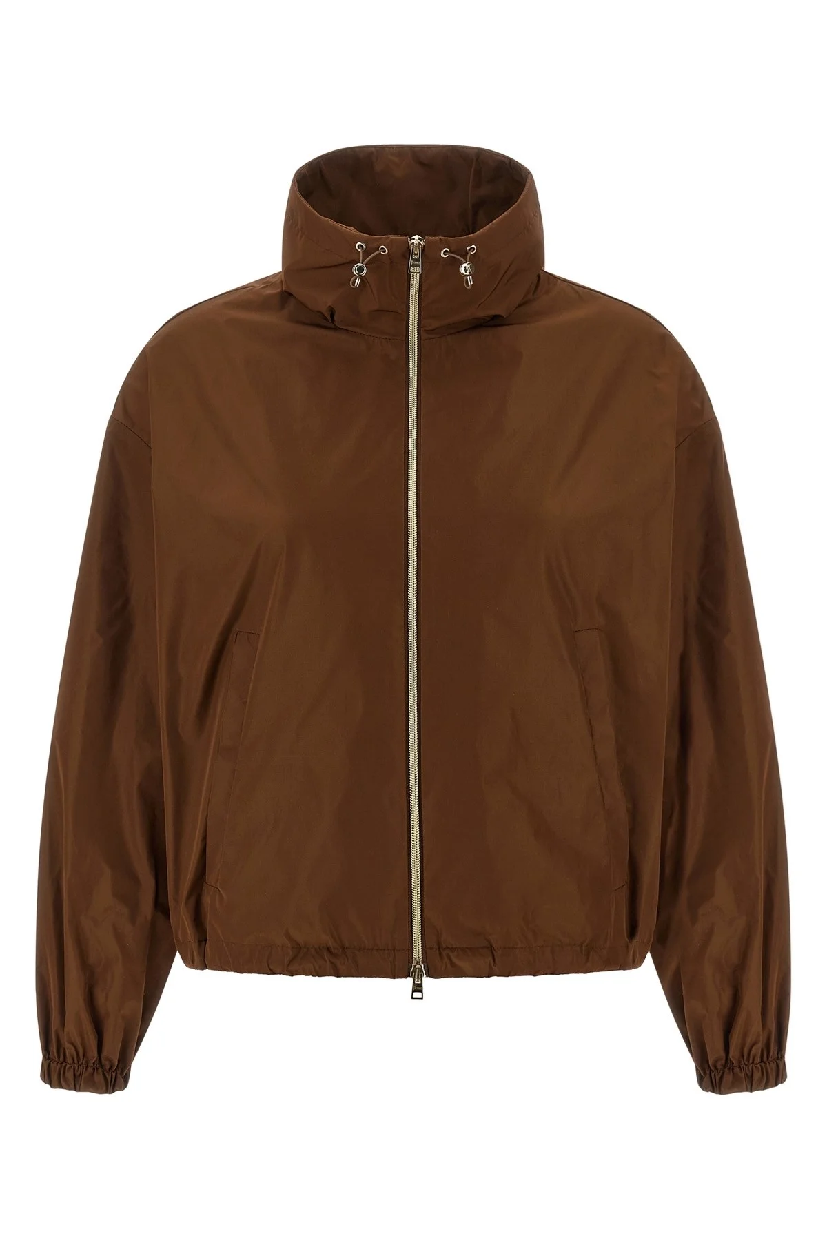 cod. GI000280D12483Z2240 New Techno Taffeta jacket with water-repellent yarn treatment and a slightly iridescent finish, crater collar with drawstring, front zip closure, pockets, long sleeves with elastic cuffs, elastic with drawstring on the hem, unlined. Color: Brown Size & Fit: Relaxed fit Composition: 100% polyester Made in: Italy