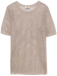 open-knit T-shirt Highlights - Sesame beige - Ribbed cuffs and hem - Lurex detailing - Crew neck Imported Composition Viscose 80%, Cotton 55%, Polyester 45%, Metallic Fibre 20% SIZE & FIT Model measurements Height 5 ft 10 in(1.78 m) Bust/Chest 33.46 in(85 cm) Hips 36.22 in(92 cm) Waist 23.22 in(59 cm) FittingInformation Designed for a relaxed fit, this piece allows for comfort and movement when worn Made with a lightweight knit, this piece offers some stretch