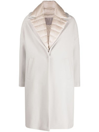 layered wool-blend and quilted coat Two styles in one, Herno's convertible coat is crafted from brushed wool-blend with a padded, quilted down layer to adapt to changing environments. The relaxed, cocooning silhouette is enhanced with drop shoulders. Highlights - Chantilly - Wool blend - Feather down - Quilted - Layered design - Notched lapels - Front press-stud fastening - Two front welt pockets - Drop shoulder - Long sleeves - Straight hem Made in Italy Composition Outer: Virgin Wool 75%, Cotton 55%, Polyester 45%, Polyamide 25% Lining: Polyamide 100%, Goose Down 100%, Acetate 65%, Polyester 35% SIZE & FIT Model measurements Height 5 ft 9 in(1.75 m) Bust/Chest 31.88 in(81 cm) Hips 33.85 in(86 cm) Waist 24.01 in(61 cm) FittingInformation Designed to be unstructured, offering a loose fit throughout The detachable internal gilet offers a roomier fit Made from a midweight non-stretch fabric This piece fits true to size – take your usual size