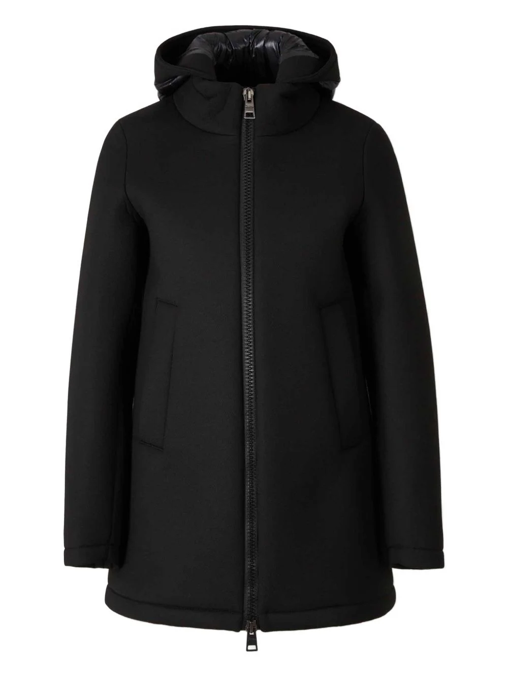 padded hooded coat Highlights - Black - Padded hood - Front zip fastening - Side welt pockets - Long sleeves - Straight hem Imported Composition Fabric 100% Washing instructions Read Manufacturer Guidelines