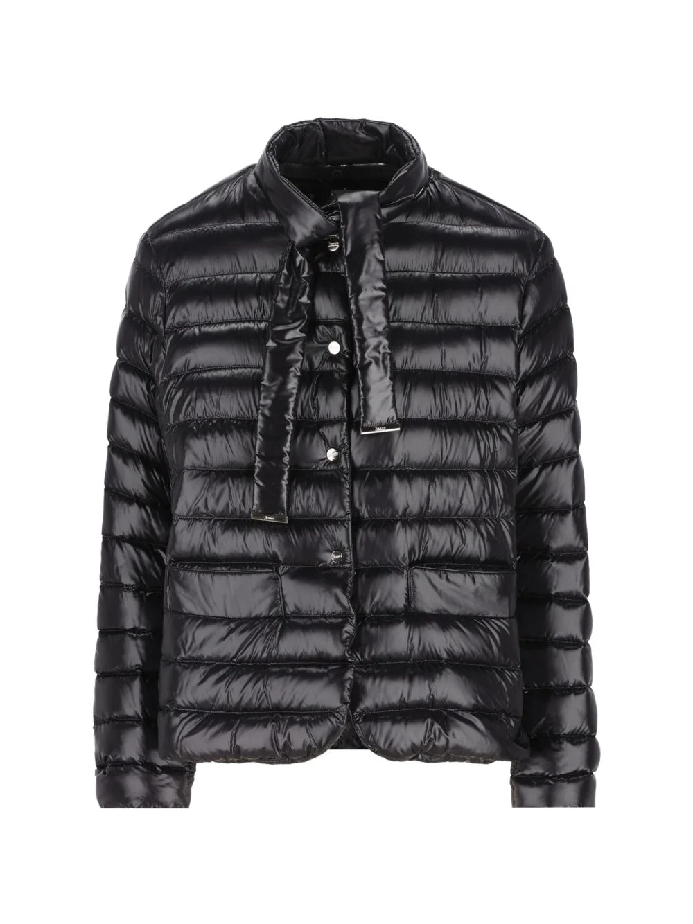 padded neck-tie coat Highlights - Black - Padded design - Neck-tie detail - Button fastening - Front buttons - Round neck Imported Composition Cotton 55%, Polyester 45% Filling: Down 90%, Feather 10%