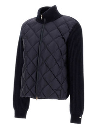 quilted panelled cardigan Highlights - Navy blue - Quilted detailing - Ribbed knit - High neck - Front zip fastening - Long sleeves - Straight hem Imported Composition Wool 100%, Acetate 65%, Polyester 35% Washing instructions Read Manufacturer Guidelines