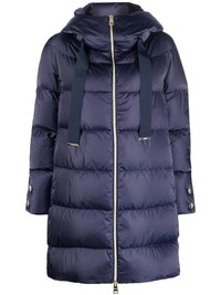 Raso hooded padded coat Designed for effortless cold-weather styling, this Herno coat features a feather-down interior. A protective high-neck design and a drawstring hood finish off this design, ensuring supreme comfort in colder climes. Highlights - Navy blue - Textured finish - Padded design - Goose down-feather blend - Quilted - Drawstring hood - Long sleeves - Buttoned cuffs - Two side inset pockets - Straight hem - Front zip fastening Imported Composition Outer: Polyester 100% Lining: Polyamide 100%, Feather Down 100% SIZE & FIT Model measurements Height 5 ft 10 in(1.79 m) Bust/Chest 31.49 in(80 cm) Hips 35.03 in(89 cm) Waist 23.62 in(60 cm) FittingInformation Designed to be unstructured, offering a loose fit throughout Made from a padded non-stretch fabric, giving it no natural elasticity This piece fits true to size – take your usual size Washing instructions Dry Clean Only