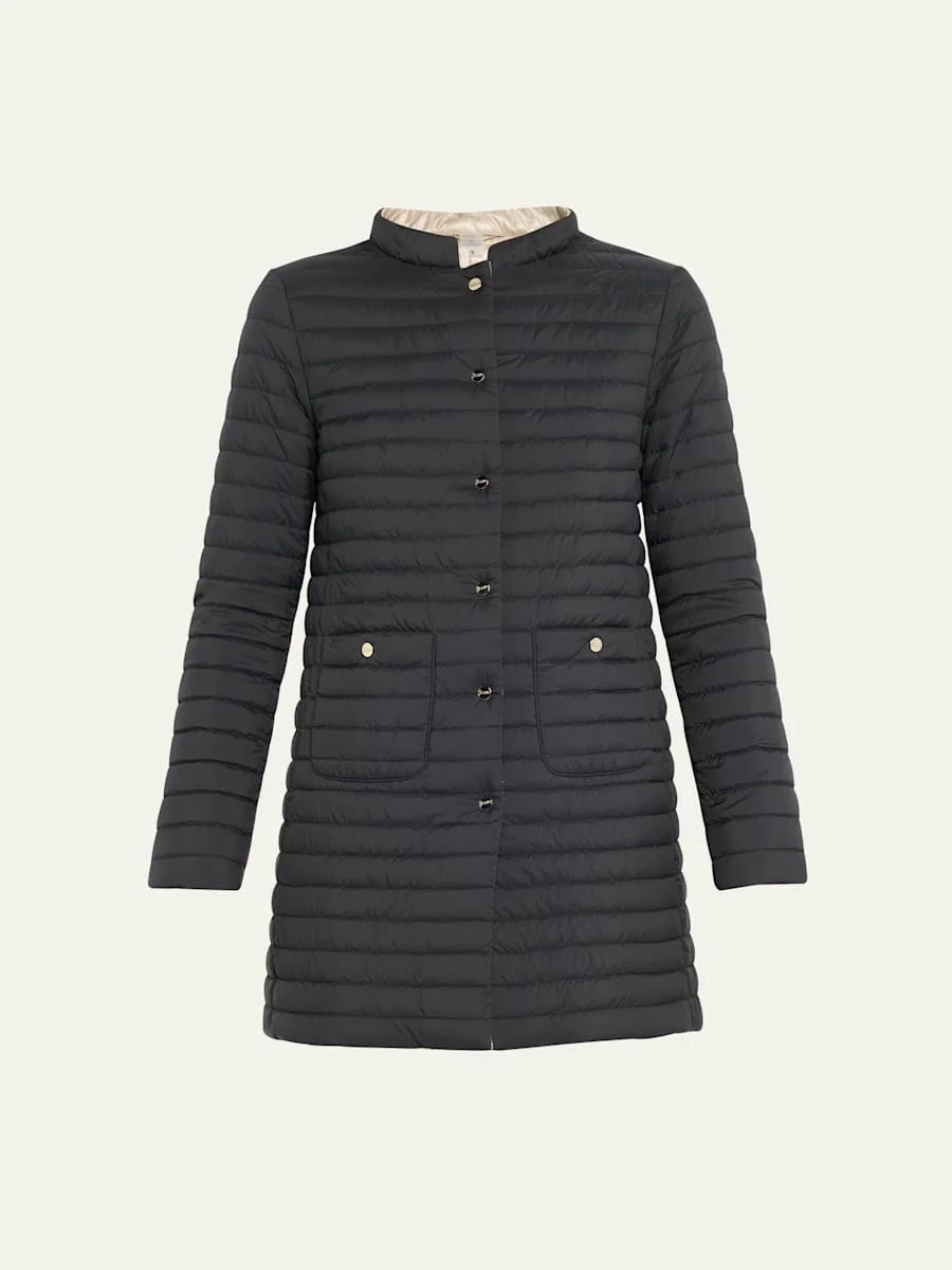 Herno quilted A-shape coat that reverses from matte to shiny nylon Water-repellent Stand collar Long sleeves Patch pockets with snap closure Classic fit Hem falls to the hip Snap-front Nylon/polyamide Fill: Down/feather Lining: Nylon/polyamide Dry clean Imported Online Inquiries: BGS21_T6KLG| Store Inquiries: #4997732