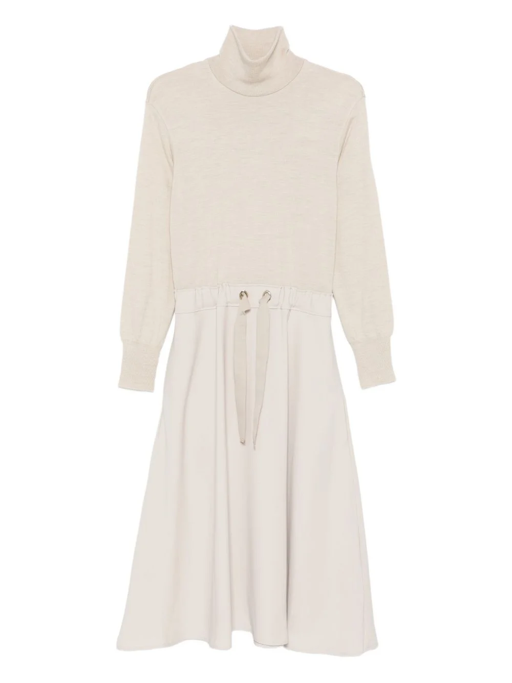 roll-neck tie dress Highlights - Light beige - Roll neck - Long sleeves - Tie detailing - Gathered waist - A-line skirt Imported Composition Fabric 100% SIZE & FIT Model measurements Height 5 ft 11 in(1.8 m) Bust/Chest 30.7 in(78 cm) Hips 35.23 in(89.5 cm) Waist 25.19 in(64 cm) Washing instructions Read Manufacturer Guidelines