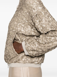 sequin-embellished bomber jacket Highlights - Gold-tone/light beige - Sequin embellishment - Ribbed band collar - Front two-way zip fastening - Drop shoulder - Long sleeves - Ribbed cuffs and hem - Two side slit pockets - Full lining - This piece features very delicate detailing. handle with extreme care to avoid damage such as broken feathers or loss of sequins. Imported Composition Outer: Wool 100%, Polyester 95%, Spandex/Elastane 5% Lining: Acetate 65%, Polyester 35% SIZE & FIT Model measurements Height 5 ft 10 in(1.77 m) Bust/Chest 32.28 in(82 cm) Hips 35.03 in(89 cm) Waist 25.19 in(64 cm) FittingInformation Designed for a relaxed fit, this piece allows for comfort and movement when worn The elasticated waist allows for a comfortable fit Made from a midweight non-stretch fabric This piece fits true to size – take your usual size