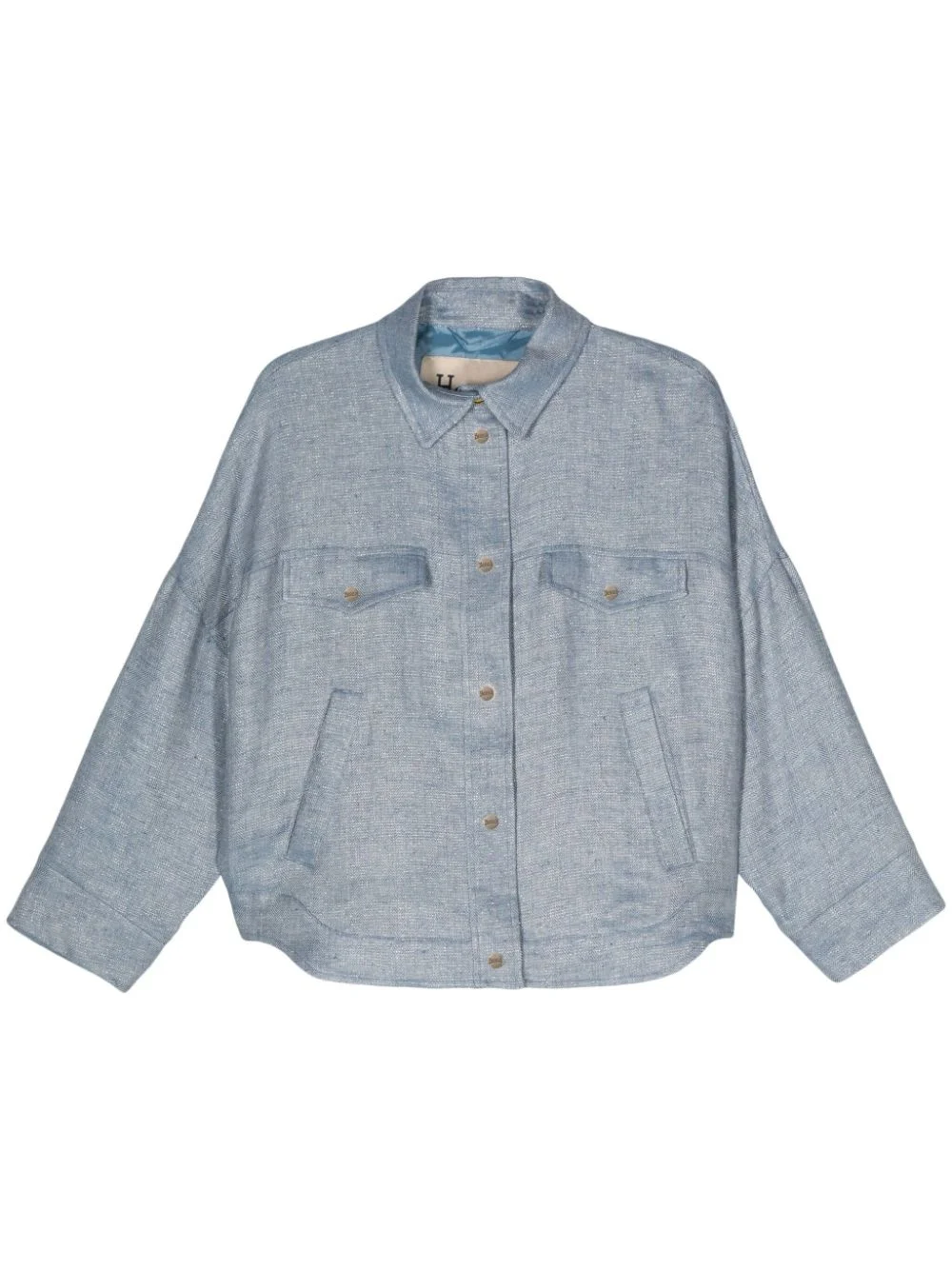 logo-engraved buttons herringbone jacket Highlights - Blue celeste - Linen blend - Herringbone pattern - Metallic threading - Logo-engraved buttons - Box-pleat detail - Classic collar - Drop shoulder - Long sleeves - Decorative button flap - Two side welt pockets - Curved hem - Front press-stud fastening Made in Italy Composition Outer: Linen/Flax 98%, Cotton 65%, Polyester 35%, Metallic Fibre 1%, Polyamide 1% Lining: Acetate 65%, Polyester 35%