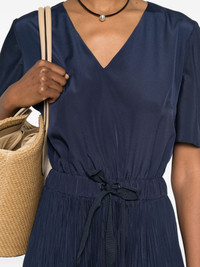 pleated V-neck dress Highlights - Navy blue - Pleated skirt - V-neck - Short sleeves - Drawstring waist - Midi length Made in Italy Composition Polyester 100% Washing instructions Dry Clean Only