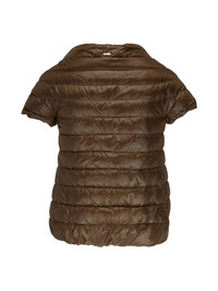 short-sleeve quilted down jacket olive green quilted panels down-feather filling high neck short sleeves concealed front fastening Made in United States Composition Lining: Feather Down 100% Outer: Polyamide 100%