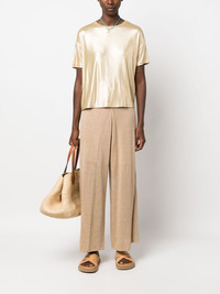 short-sleeved jersey T-shirt Highlights - Gold-tone - Stretch-jersey - Metallic finish - Round neck - Drop shoulder - Short sleeves - Straight hem Made in Italy Composition Viscose 92%, Elastane 8% SIZE & FIT Model measurements Height 5 ft 10 in(1.78 m) Bust/Chest 31.49 in(80 cm) Hips 37 in(94 cm) Waist 23.62 in(60 cm) FittingInformation Designed to be unstructured, offering a loose fit throughout Made from a lightweight stretch fabric, this piece offers elasticity and flexibility when worn This piece fits true to size – take your usual size Washing instructions Hand Wash
