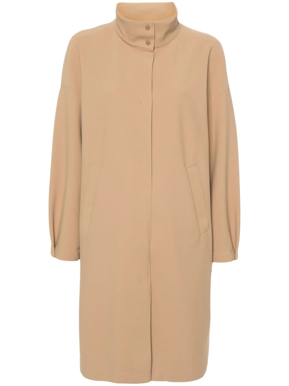 single-breasted midi coat Highlights - Sand beige - Stretch-design - Taffeta - Stand-up collar - Drop shoulder - Long sleeves - Press-stud fastening cuffs - Two front welt pockets - Curved hem - Unlined - Concealed front press-stud fastening Imported Composition Lining: Polyamide 75%, Elastane 25% Outer: Polyamide 75%, Elastane 25% SIZE & FIT Model measurements Height 5 ft 11 in(1.8 m) Bust/Chest 33.07 in(84 cm) Hips 37.4 in(95 cm) Waist 25.19 in(64 cm) FittingInformation Designed to be unstructured, offering a loose fit throughout Made from a midweight stretch fabric, this piece offers elasticity and flexibility when worn This piece fits true to size – take your usual size