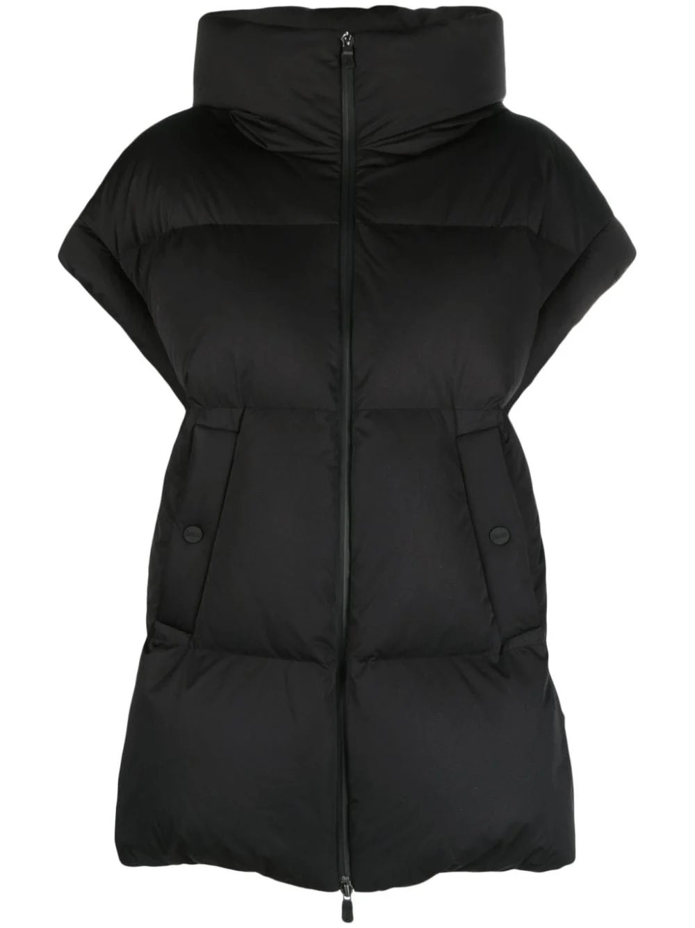short-sleeve down jacket Herno's puffer jacket showcases the brand's affinity for creating outerwear that protects against the elements. Padded throughout and filled with down feathers, it features short sleeves. Highlights - Black - Padded design - Down-feather filling - Classic hood - High neck - Front zip fastening - Short sleeves - Two side button-fastening pockets - Straight hem Imported Composition Polyester 100% SIZE & FIT Model measurements Height 5 ft 10 in(1.79 m) Bust/Chest 31.1 in(79 cm) Hips 35.03 in(89 cm) Waist 24.01 in(61 cm) FittingInformation Designed for a relaxed fit, this piece allows for comfort and movement when worn Made from a padded non-stretch fabric, giving it no natural elasticity This piece fits true to size – take your usual size