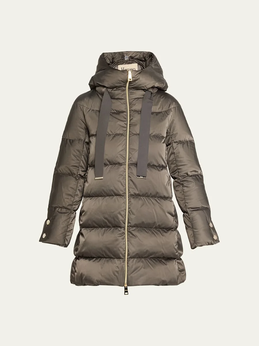 Insulated with premium goose down filling, this Herno jacket is crafted from signature Ultralight Nylon and boasts a luxurious satin finish with a silk handfeel, creating a chic silhouette that retains heat in the coldest weather. Hooded neckline with ribbon drawstrings Long sleeves with snap cuffs Invisible side zip pockets Aline silhouette Midthigh length Twoway zipfront Nylon/polyamide/polyester Fill: Down/feather Machine wash cold Imported SIZE amp; FIT Model measurements: 5'10" tall Model is wearing a US size 4/Small