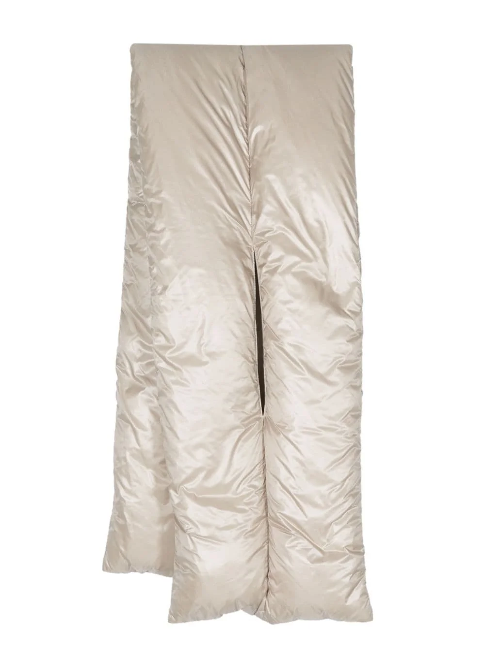 wraparound padded-down scarf Highlights - Almond beige - Goose feather - Padded design - Wraparound style - Cut-out detailing Imported Composition Outer: Polyamide 100% Lining: Polyamide 100%, Goose Feather 100% SIZE & FIT Measurement LENGTH 46.06 in(117 cm) WIDTH 8.66 in(22 cm) Washing instructions Hand Wash