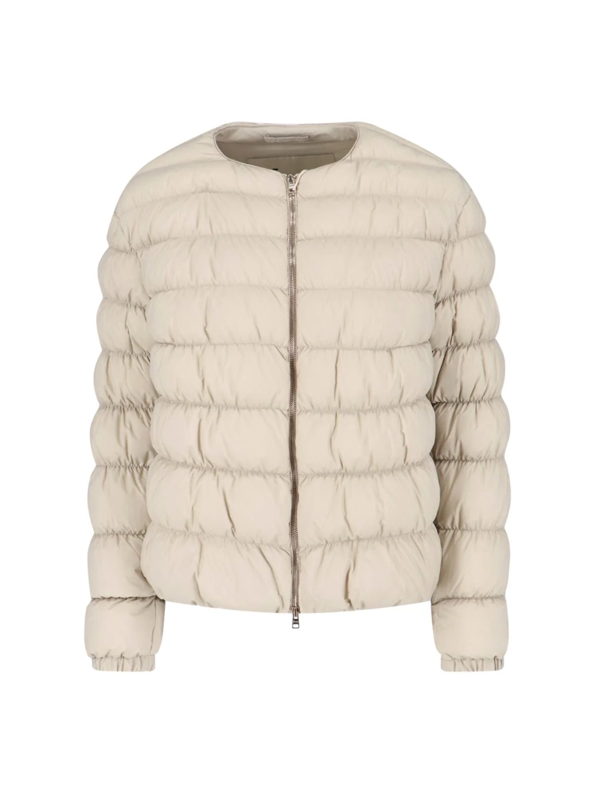 HERNO ZIP DOWN JACKET IN CREAM FABRIC WITH CREW NECK, LONG SLEEVES, ZIP CLOSURE, GOLD METAL LOGO TAG ON THE BACK, ELASTIC TRIMS, STRAIGHT HEM. PRODUCT INFO PRODUCT CODE PI002186D 12456Z1985 COMPOSITION: 100% POLYAMIDE SIZE AND FIT: SLIM FIT MADE IN: ROMANIA
