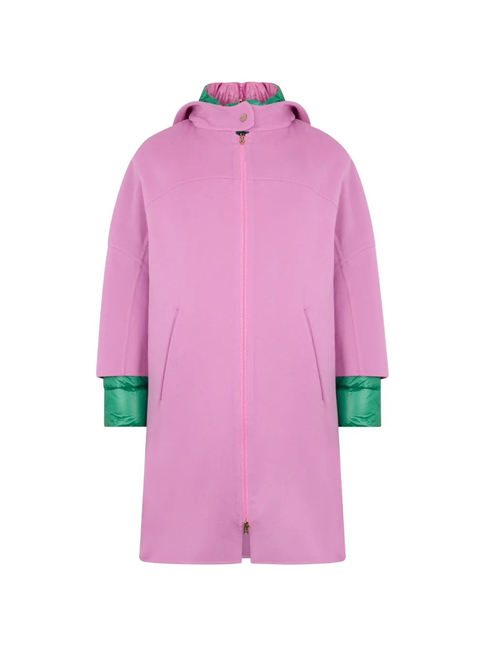 zip-up hooded coat Highlights - Pink - Green padded cuff - Hooded neck - Zip fastening Made in Italy Composition Wool 99%, Polyamide 1% Washing instructions Read Manufacturer Guidelines