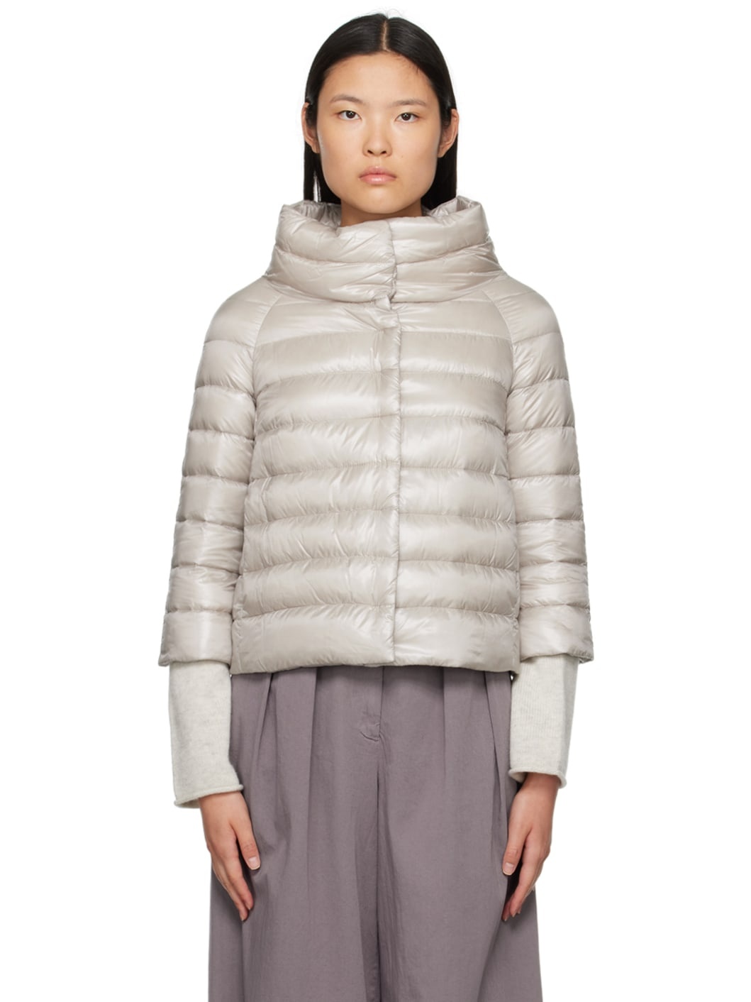 Lightweight down-filled quilted nylon satin jacket. · Funnel neck · Concealed press-stud closure · Seam pockets · Raglan sleeves · Logo plaque at back collar · Full satin lining Supplier color: Silver pearl Fill: 90% goose down, 10% goose feather.