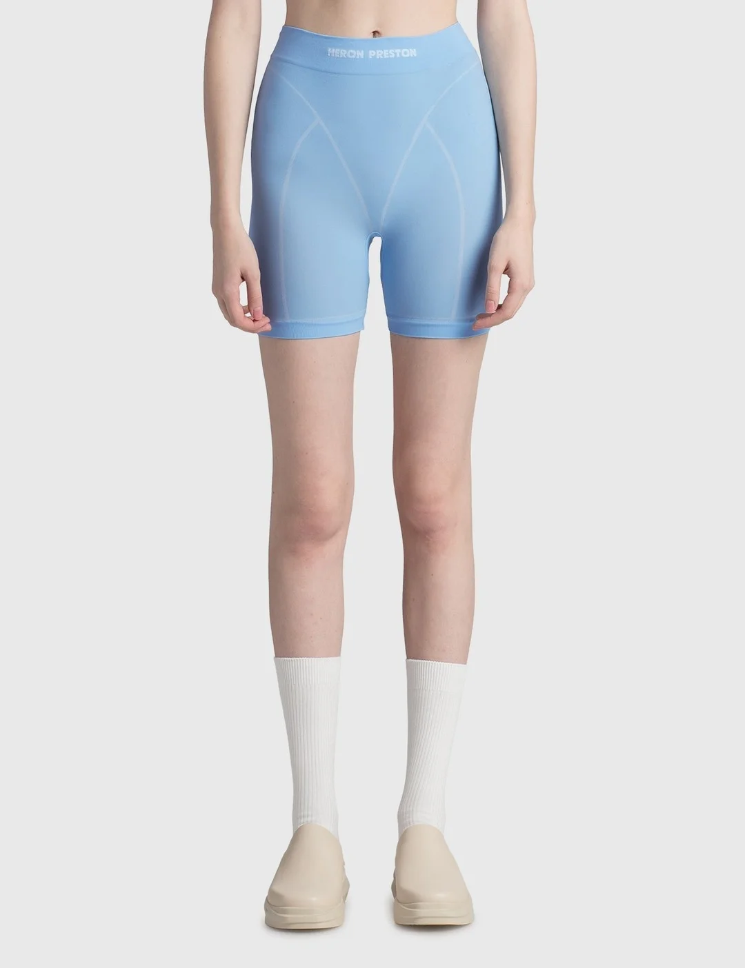 - Heron Preston - Active Logo Shorts - Stretch nylon exterior - Branded elasticated waistband - Logo patch at rear waist - Ribbed, elasticated cuffs - Color: Baby Blue - Material: 92% Polyamide, 8% Elastane - See more - Shorts - and - Clothing SIZING - Model wears size S/M - Model measures: Height 181cm, Chest 33”/84cm, Waist 24”/61cm, Hip 35”/90cm