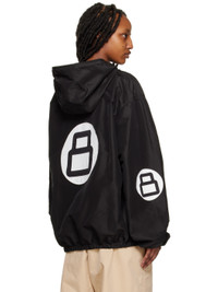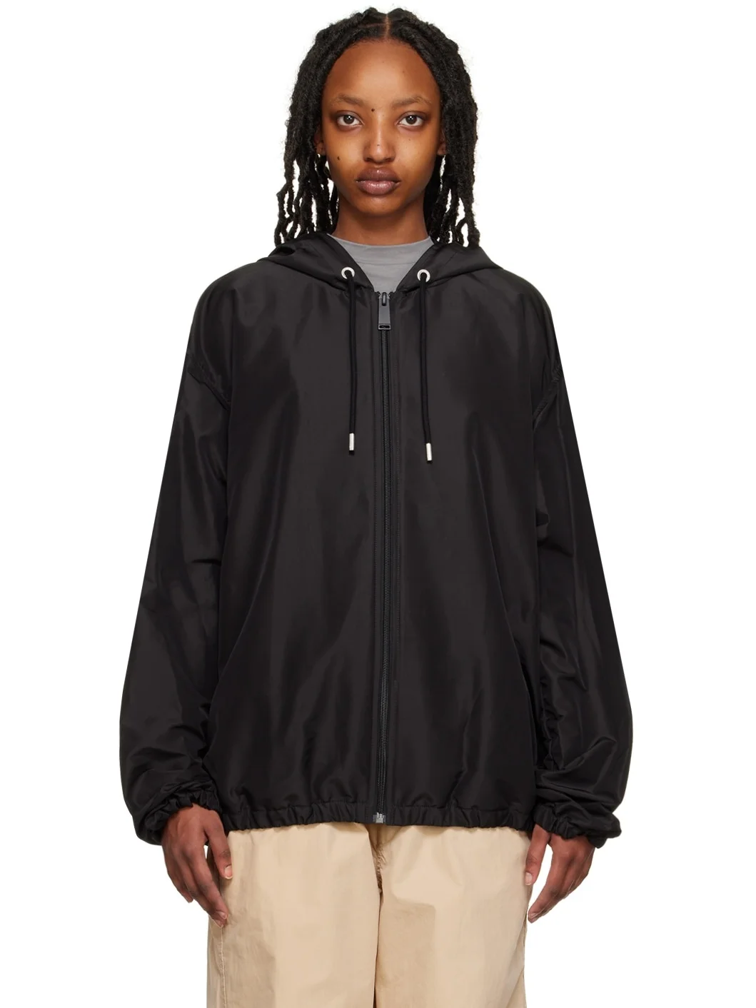 Polyester taffeta jacket. · Drawstring at hood · Zip closure · Seam pockets · Elasticized hem and cuffs · Embroidered logo patch at elbows and back · Logo patch at cuff Supplier color: Black 100% polyester. Made in Italy 231967F063002