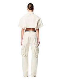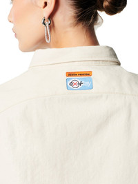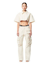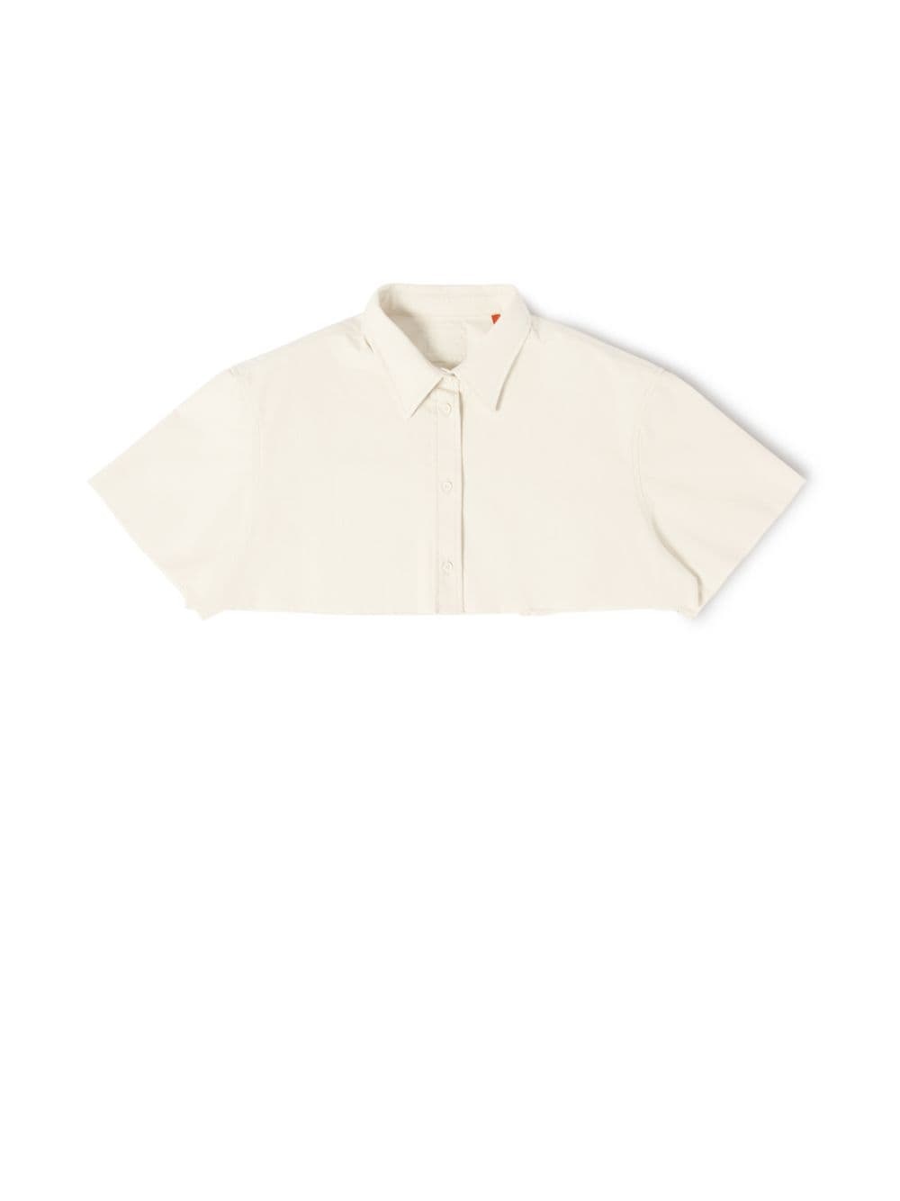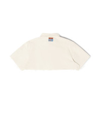 White canvas crop top featuring Ex-Ray logo at back. Orange logo patch at back. Spread collar, button up closure. Loose fit. 100% Cotton Model Claudia Vega wears size S Height: 5' 8.5" (174cm) Chest: 31" (80cm) Waist: 23" (59cm) Product ID: HWGG001S23FAB0010100