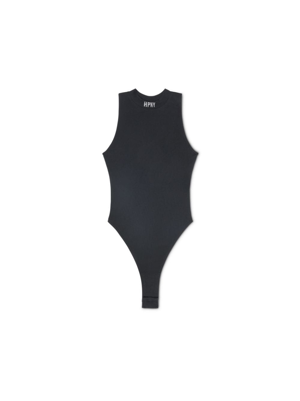 Semi-transparent sleveless black bodysuit featuring HPNY white logo embroidered at neck. Crewneck collar. 99% Viscose 100% Polyester 1% Spandex/Elastane Model Claudia Vega wears size S Height: 5' 8.5" (174cm) Chest: 31" (80cm) Waist: 23" (59cm) Product ID: HWDD024C99JER0021001
