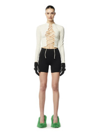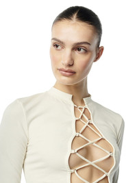 lace-up crop top from HERON PRESTON featuring ivory white, stretch-design, cotton blend, logo patch to the rear, round neck, front lace-up fastening, long sleeves and cropped. 28% Polyester 7% Elastane 65% Cotton Bust 0cm Height 0cm Hips 0cm Waist 0cm Product ID: HWAB029F23JER0010400