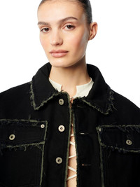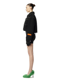 distressed cropped denim jacket from HERON PRESTON featuring black, cotton, distressed effect, logo patch at the sleeve, classic collar, front button fastening, long sleeves, buttoned cuffs, two chest flap pockets and cropped. 72% Polyester 100% Cotton 23% Polyamide 5% Polypropylene Bust 0cm Height 0cm Hips 0cm Waist 0cm Product ID: HWYE013F23DEN0011000