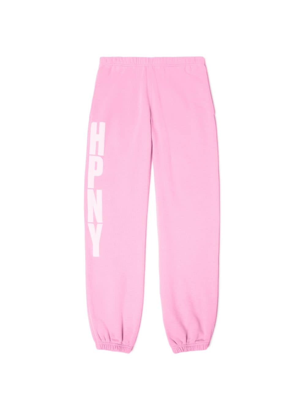 Pink sweatpants featuring white HPNY stamp at leg. Orange logo patch at back. Two side pockets, elasticated waistband and ankle cuffs. 100% Cotton Model Claudia Vega wears size 40 Height: 5' 8.5" (174cm) Waist: 23" (59cm) Hips: 35" (88cm) Product ID: HWCH003S23JER0013201